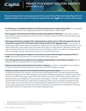 - As of February 1, AI Insight by iCapital covers 270 private placements currently raising capital, with an aggregate target raise of $50.5 billion and an aggregate reported raise of $34.3 billion or 68% of target.1