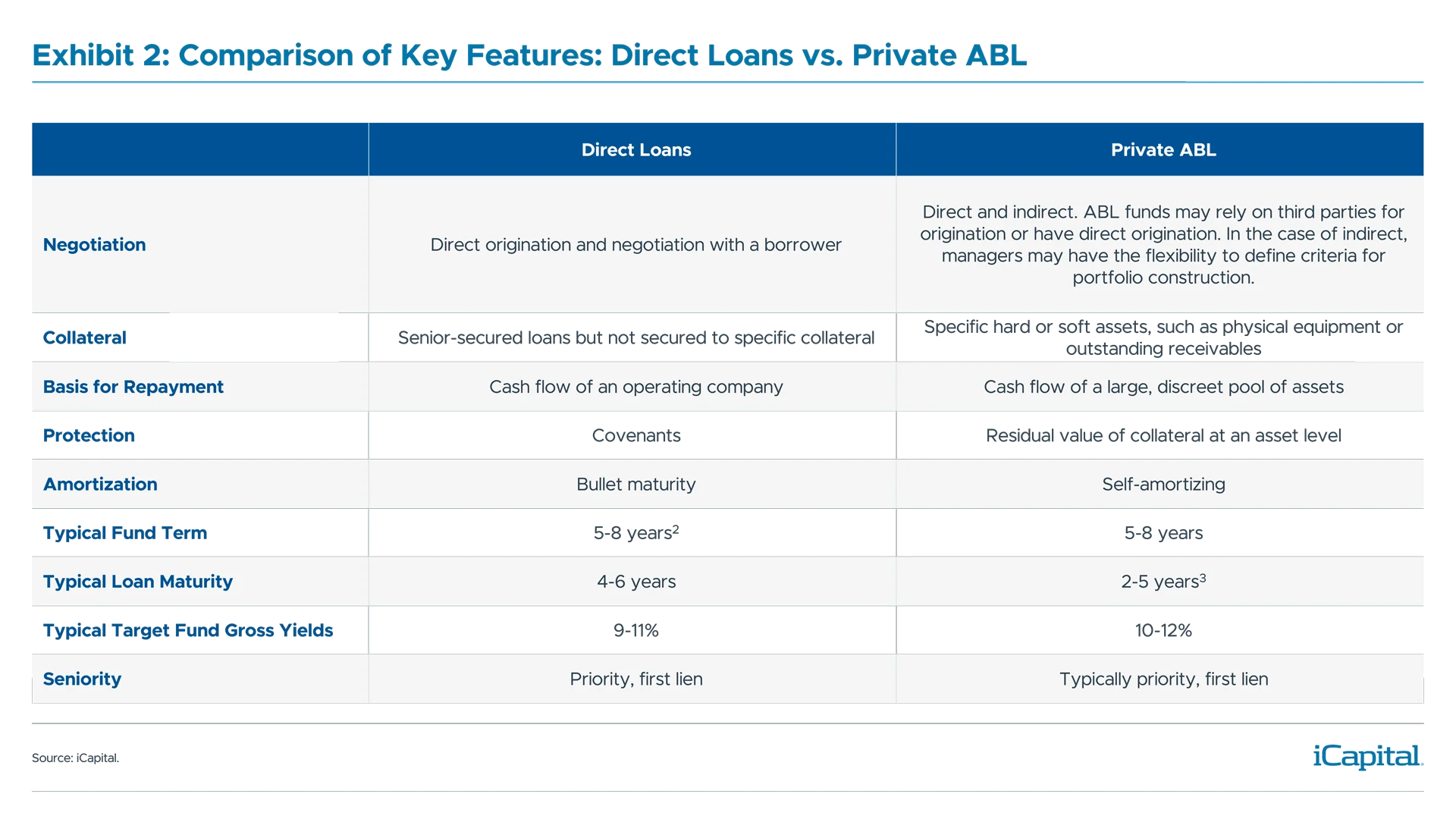 In theory, ABL funds should be a logical choice for private wealth investors. The self-amortizing profile provides high current income while mitigating refinancing and duration risk. And the underlying collateral provides downside protection – as low direct lending loss rates are at roughly 100 basis points (bps), ABL is even lower, with average loss rates of 10 to 20 bps.6