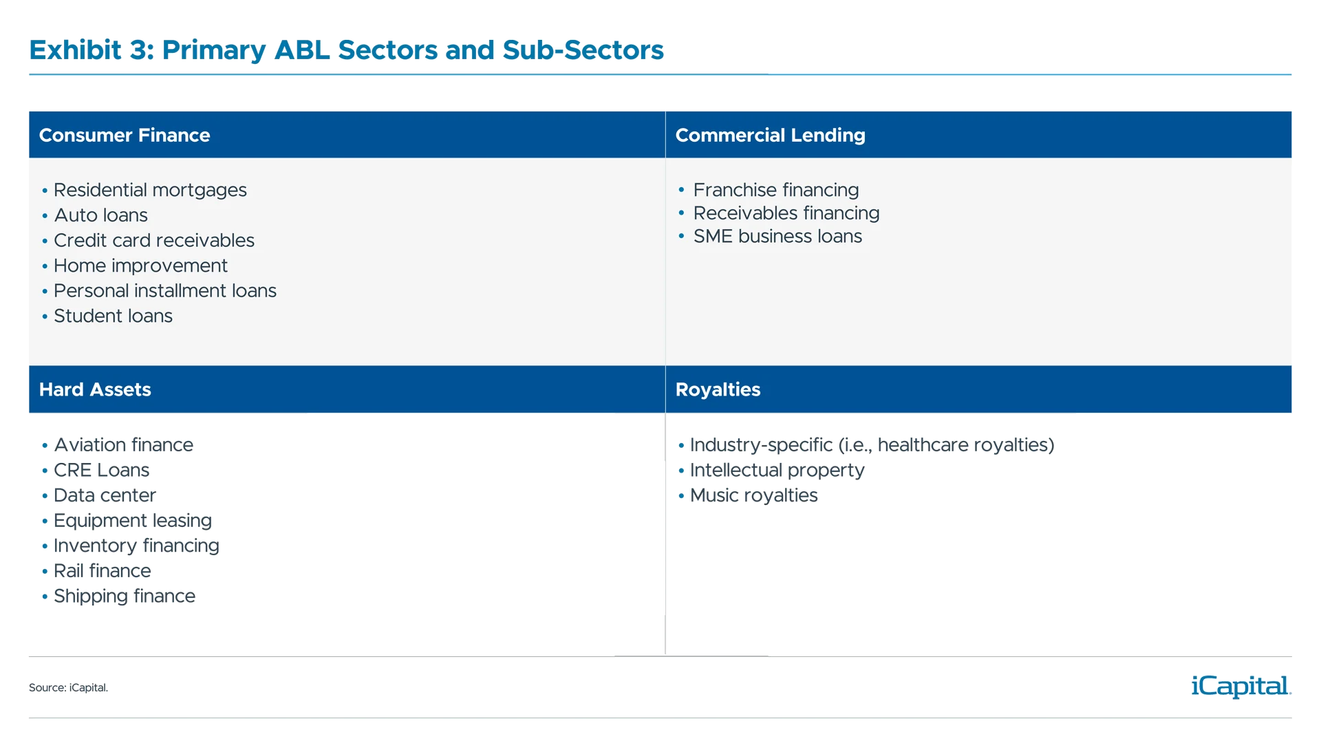 Concerns of sub- and near-prime assetsPrivate ABL fund managers have flexibility in specifying risk and return parameters based on pre-approved guidelines for asset selection. Meaning there’s a low likelihood that a fund will have elevated credit risk due to exposure to sub-prime assets. The subordinated equity layer also absorbs higher-risk assets first, in the event that assets come under stress. Inexperience with unfamiliar assetsAreas such as aviation finance, equipment leasing, and receivables financing are unfamiliar to many investors. This alone doesn’t mean these areas should be avoided, but it does mean the risks and investment processes should be explored and understood. Best-in-class fund managers have well-established credit platforms to evaluate, source, value, and manage many different types of assets. Most of these managers have specialized investment teams with expertise in target industry verticals. While individual sub-asset classes such as equipment or shipping finance can be considered niche, an ABL fund will often contain hundreds of loans to different borrowers in different geographic areas, providing the benefit of diversification. When looking at the aggregate ABL opportunity, residential mortgage, and commercial real estate are the largest sub-sectors. These areas are generally better understood, are more standardized, and face tight underwriting standards. For investors who seek exposure to some of these niche areas, the risks are different. In aviation finance, for example, fleet capacity, production and delivery measures, fuel prices, interest rates, and labor harmony are all factors that impact airline lease rates. Specialized investment teams are responsible for analysis and diligence and have years of sector experience. Fear of trying to follow a vast universeIdentifying and evaluating fundamentals and risk factors across a broad set of assets is daunting. Fortunately, fund managers take an active role throughout the life of an investment to limit the potential for losses. This includes specific origination requirements for borrowers, strong documentation, and robust servicing capabilities to ensure repayment while also granting real-time visibility into the performance of an asset, helping to ensure the borrower is financially healthy. For investors who like a hands-on approach, categorizing assets by sector is a starting point to identify performance and risk measures. We see the aggregate asset-based market in four categories, as seen in Exhibit 3.