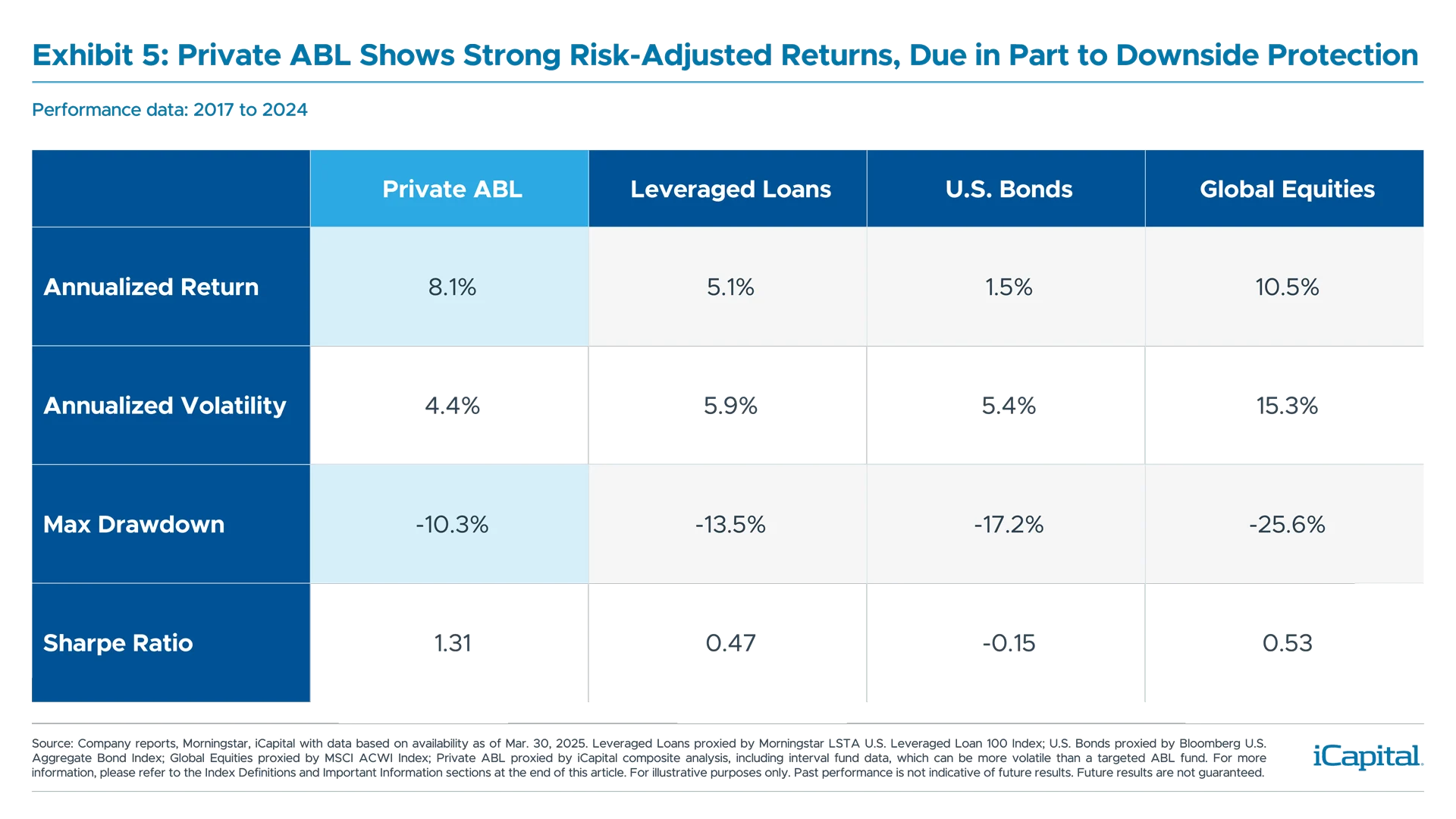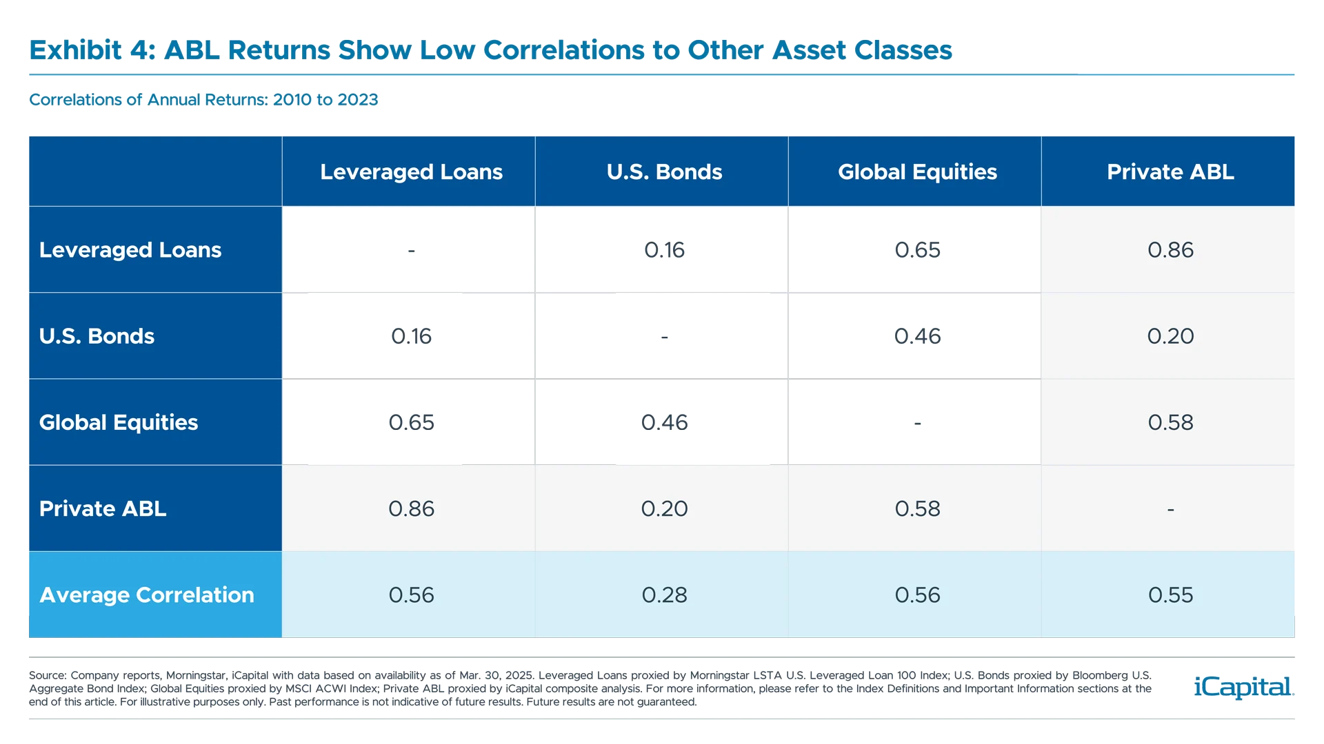 Private ABL Composite: iCapital analysis of six private ABL and alternative lending funds. Due to the scarcity of private ABL fund and fund data, iCapital calculated return, volatility and correlation data from fund and company reports to represent a composite.