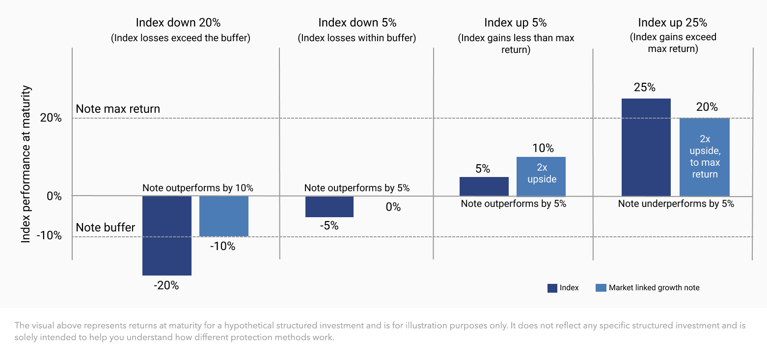- Enhanced upside: Some buffered notes deliver more than 1x participation in gains of the underlying index, up to a stated cap. The leverage generates outperformance during low to moderate growth environments.